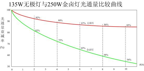 超長壽命:無極燈沒有燈絲和電極,壽命可達6萬小時以上,是白熾燈的60倍,鹵素?zé)舻?0倍。