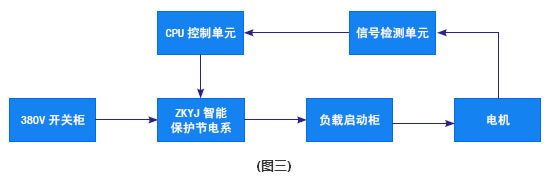 由圖三所示,在低壓380V開關柜與負載(風機、水泵、空壓機、及電機拖動類)啟動柜之間串接智能保護節(jié)電系統(tǒng),系統(tǒng)在電機的使用上,它能自動跟蹤檢測電機運行中的負載變化,將檢測信號反饋給控制中心,經(jīng)過中央處理,運算放大后給出指令信號,以此來改變有功電量的輸出,使電機在最經(jīng)濟的電耗下運行,達到節(jié)電的目的。