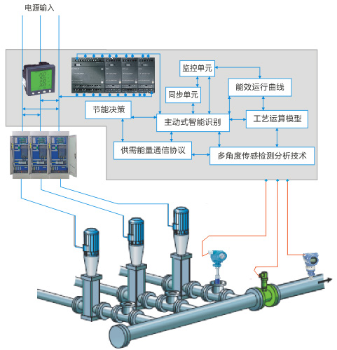 首先,架設(shè)工藝需求側(cè)與能量供應(yīng)側(cè)的通信機(jī)制,采用多角度傳感檢測(cè)技術(shù)對(duì)生產(chǎn)工藝需求值進(jìn)行精準(zhǔn)檢測(cè),對(duì)水泵運(yùn)行的輸出供應(yīng)能量值進(jìn)行實(shí)時(shí)動(dòng)態(tài)監(jiān)測(cè),使供需能量間保持平衡狀態(tài),減少能量損失。