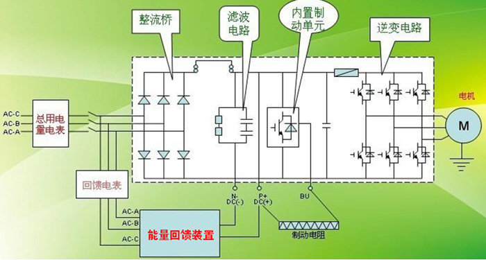 電梯是一個位能性負載,為了均勻拖動負荷,電梯負載由載客轎 廂和對重平衡塊組成。只有當轎廂載重量約為50%(如1噸載客電梯乘客為7人左右)時,轎廂和對重平衡塊才處于雙方質量基本平衡狀態(tài),否則,轎廂和對重平 衡塊就會有質量差,使電梯運行時產(chǎn)生機械位能(發(fā)電狀態(tài))。傳統(tǒng)的方式是采用采用制動單元和外加大功率電阻,將位能產(chǎn)生的電量以發(fā)熱方式消耗掉。
