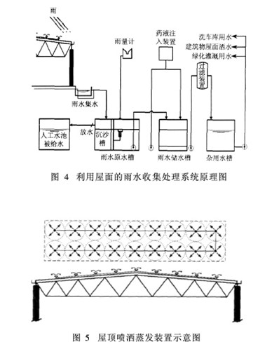 收集來(lái)的雨水經(jīng)過(guò)處理后不僅可用來(lái)洗車、澆灑道路,還可以有針對(duì)性地冷卻建筑構(gòu)件(見圖4)。一般來(lái)說(shuō),停車場(chǎng)運(yùn)用檢修庫(kù)夏季室內(nèi)高溫悶熱。如上海軌道交通3號(hào)線石龍路運(yùn)用檢修庫(kù)由于是鋼結(jié)構(gòu)彩鋼板建筑形式,保溫隔熱效果不佳,夏季白天室內(nèi)溫度高達(dá)40℃。而上海軌道交通4號(hào)線蒲匯塘停車場(chǎng)運(yùn)用檢修庫(kù)采用預(yù)應(yīng)力混凝土結(jié)構(gòu),屋面植被綠化,比較好地降低了室內(nèi)的溫度;但是預(yù)應(yīng)力混凝土結(jié)構(gòu)由于屋面自重較重,框架柱截面較大,減少了庫(kù)內(nèi)的使用空間,且混凝土結(jié)構(gòu)在建筑廢棄后難以再利用和降解,因此這種形式不建議推廣。富錦路停車場(chǎng)運(yùn)用檢修庫(kù)吸取了上述兩種形式的優(yōu)點(diǎn),采用現(xiàn)澆鋼筑混凝土排架結(jié)構(gòu),屋面采用網(wǎng)架結(jié)構(gòu),屋面透光性好,自重較輕;但夏天陽(yáng)光照射仍可能引起室內(nèi)溫度過(guò)高,可以通過(guò)在屋面頂部安裝噴灑蒸發(fā)裝置對(duì)屋面進(jìn)行冷卻(見圖5)。