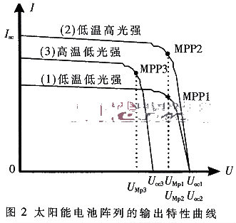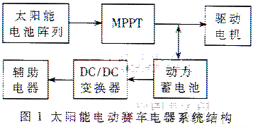 太陽能賽車是利用太陽能電池發(fā)電驅(qū)動的電動車。太陽能電動賽車的電器系統(tǒng)基本結(jié)構(gòu)如圖1所示。 MPPT(Maximum Power Point Tracker)即峰值功率跟蹤器,是太陽能電池發(fā)電系統(tǒng)中的重要部件。眾所周知,在確定的外部條件下,隨著負載的變化,太陽能電池陣列輸出功率也會變 化,但是存在一個最大功率點Pm以及與最大功率點相對應的電壓UMp和電流IMD。當工作環(huán)境變化時,特別是日光照度和環(huán)境溫度變化時,太陽能電池陣列的 輸出特性曲線也隨之變化,與之相對應的最大功率點也隨之改變,如圖2所示。通常來講,太陽能電池輸出特性曲線的變化與日光照度的變化是成比例的。但在實際 應用中,日光照度的變化再加上工作溫度的變化,使得太陽能電池輸出特性的變化很復雜。