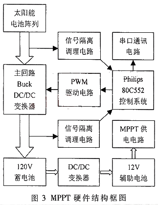 MPPT的硬件包括MPPT主回路、微處理器、信號調(diào)理電路、PWM驅(qū)動電路、電源、通信接口等六個部分。其硬件結(jié)構(gòu)如圖3所示。 MPPT的電壓轉(zhuǎn)換器采用Buck DC/DC轉(zhuǎn)換器,以MOTOROLA場效應管作為電子開關(guān)器件;采用PWM控制方式,工作頻率為16kHz。由上述的太陽能電池陣列電壓與蓄電池電壓可 知,MPPT的Buck DC/DC轉(zhuǎn)換器的降壓比在0.6~1.0之間。在這個降壓比范圍內(nèi),MPPT的轉(zhuǎn)換效率在86%~99%之間。 由于采用了Buck DC/DC轉(zhuǎn)換器,在太陽能電池陣列的工作電壓高于蓄電池電壓的情況下,通過調(diào)整BuckDC/DC轉(zhuǎn)換器的占空比即可改變太陽能電池陣列的工作電壓 [3]。MPPT的Buck DC/DC轉(zhuǎn)換器的電感上L=4mH,臨界負載電流Iok為: Iok=(Vout/2Lf)/(1-D) Iok|D=0.7=120V/(2%26;#215;4mH%26;#215;13kHz)(1-0.7)≈0.35A 當電流I0.35A、占空比D0.7時,