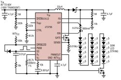 LT3756包含了高壓側(cè)電流檢測,從而使該器件能用在升壓、降壓、降壓/升壓或SEPIC和反激式拓?fù)渲?。在這個例子中,LT3756用于升 壓模式,可以提供超過94%的效率,無需散熱措施。頻率調(diào)節(jié)引腳允許用戶在100kHz至1MHz范圍內(nèi)對頻率編程,從而優(yōu)化效率,并最大限度減小外部組 件尺寸和成本。采用3x3mm QFN封裝的LT3756可提供一個非常緊湊的50W至75WLED驅(qū)動器解決方案。