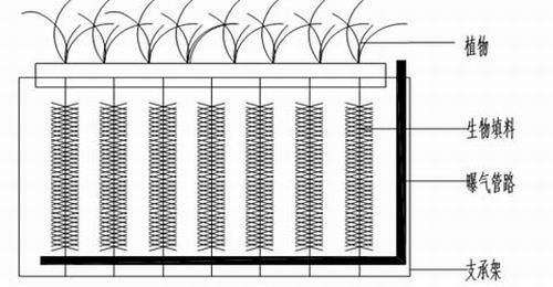 植物修修復過程中,實際靠植物直接吸收去除的污染物質還不到實際去除率的一半,這其中植物與微生物的聯(lián)合作用有非常大的貢獻,植物可能從增加根際氧濃度, 分泌微生物營養(yǎng)物質或者活性物質以及為微生物提供載體等方面影響微生物的密度和分布。利用生物膜——生態(tài)復合強化處理技術處理重污染河段,可以通過人工強 化復氧和植物分泌和外加附著載體多方面刺激微生物的生長,提高微生物的處理效應,同時載體的吸附和植物的吸收三重去除可大大提高系統(tǒng)對水中污染物的去除效 率。處理采用好氧,缺氧兩級處理,以達到更佳的處理效果。