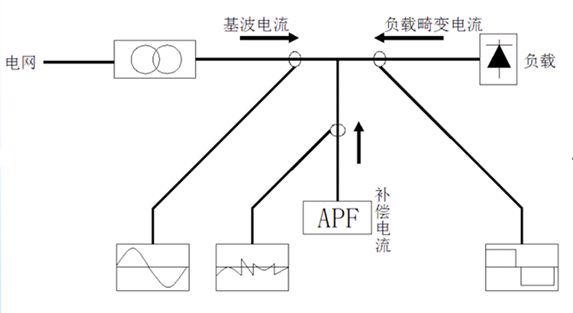 ANAPF有源濾波裝置的原理:以并聯方式接入電網,通過實時監(jiān)測負載的諧波和無功分量,采用PWM變流技術,從變流器中產生一個和當前諧波分量和無功分量對應的反向分量并實時注入電力系統,從而實現諧波治理和無功補償。