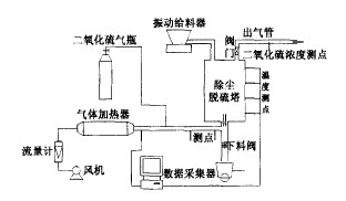為了驗(yàn)證不同配方的顆粒脫硫劑和運(yùn)行參數(shù)等對(duì)顆粒床煙氣脫硫效率的影響,搭建了小型脫硫?qū)嶒?yàn)臺(tái),開展了脫硫?qū)嶒?yàn)研究。自鼓風(fēng)機(jī)來的空氣先經(jīng)過玻璃轉(zhuǎn)子 流量計(jì),再送入電加熱器,在電加熱器中空氣被加熱到150~600 ℃。SO2氣體由鋼瓶經(jīng)流量計(jì)計(jì)量后,送入氣體混合加熱管與熱空氣混合。均勻混合的含高濃度SO2 的熱空氣進(jìn)入顆粒脫硫塔。顆粒脫硫劑由振動(dòng)給料機(jī)從顆粒脫硫塔的上端進(jìn)入床內(nèi)填充料層,含硫氣體經(jīng)過填充料層時(shí)被脫除掉硫份,干凈的空氣從氣體出口排出。 顆粒料床內(nèi)的物料通過底部卸料機(jī)排料。實(shí)驗(yàn)中保證顆粒床內(nèi)的料層高度不變。在脫硫塔中,顆粒自進(jìn)入料層后一邊吸收SO2 ,一邊緩慢向下移動(dòng)。當(dāng)移動(dòng)到排料口時(shí),該顆粒已基本失去脫硫效能。因此必須控制移動(dòng)速度等參數(shù)。