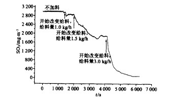 穩(wěn)定運(yùn)行一段時(shí)間后,將給料率增大至1. 5kg/ h ,可以看到SO2濃度進(jìn)一步逐漸降低。當(dāng)運(yùn)行一段時(shí)間后,床內(nèi)顆粒脫硫能力的分布和溫度的分布保持不變, 此時(shí)脫硫效率基本穩(wěn)定, 為1900 mg/ m3 ,說明達(dá)到了此給料率下SO2去除率的穩(wěn)定值,此時(shí)脫硫效率約為35 %。穩(wěn)定一段時(shí)間后,再將給料率增大到3kg/ h ,可以看到SO2濃度又進(jìn)一步降低,當(dāng)運(yùn)行一段時(shí)間后床內(nèi)顆粒脫硫能力逐漸穩(wěn)定,出口SO2濃度為100 mg/ m3 ,此時(shí)脫硫效率約為96%??梢姡o料速率對(duì)SO2脫除率有很大影響,隨著給料速率的加大,脫硫效率十分明顯。