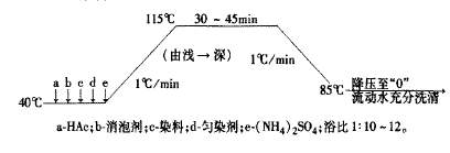 在高溫高壓噴射溢流染色機上染色。工藝處方為98%HAc0.7mL/L(染浴pH值近似5.5),消泡劑(或抑泡劑)1g/L(平幅染色機上則可省去),分散染料(偶氮結(jié)構(gòu))x%,高溫分散勻染劑ZF-802 1.5g/L,(NH4)2SO4(穩(wěn)定介質(zhì),減少缸差)2g/L。