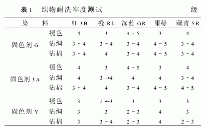 從表1可知,固色劑G和固色劑3A的耐洗牢度相仿,比固色劑Y的耐洗牢度提高1級(jí)左右,而且固色劑G的沾綢、沾棉牢度也較高。