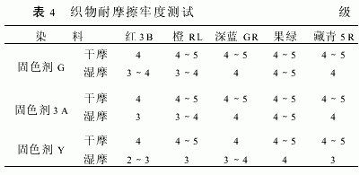 從表3可知,三種固色劑的耐水漬牢度較好,固色劑G與固色劑3A相仿,比固色劑Y略好,有些色澤能提高0 5級(jí)甚至1級(jí)。