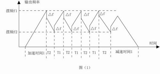 由 圖(1)可見,當變頻器驅動橫動電機達到上限頻率f1或下限頻率f2時,頻率應突變,下降為或上升,突變頻率幅值Δf一般為基本頻率f1的1%左右,突變 頻率的時間,理論上要求時0,但實際上,由于橫動裝置和電機有慣性,使得電機速度不可能突變而有一過渡時間,過渡時間通常在0.1s以上。