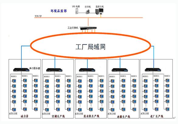 5.1 網(wǎng)絡結構拓撲圖整個系統(tǒng)采用網(wǎng)絡分布式結構,監(jiān)控主機位于辦公樓二樓的環(huán)境品質檢測部,數(shù)據(jù)采集主要劃分為三個區(qū),洗衣機生產(chǎn)回路設備、冰箱生產(chǎn)回路設備和老廠空調生產(chǎn)回路設備。電力儀表的通訊為485總線結構,將信號通過屏蔽雙絞線傳輸?shù)綌?shù)據(jù)采集器,數(shù)據(jù)采集器連入廠區(qū)的局域網(wǎng)中。