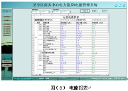 用電量報表功能,可選擇時間段進(jìn)行查詢,支持任意時間段電度累計(jì)查詢,具備數(shù)據(jù)導(dǎo)出和報表打印等功能。為值班人員提供了精確可靠的電能報表。該報表各回路名稱和數(shù)據(jù)庫關(guān)聯(lián),方便用戶修改回路名稱。如下圖所示,顯示健身中心某段時間內(nèi)的各配電回路的精確用電量,用戶可以直接打印報表,可以以EXCEL格式另存到其他位置。 見圖(8)。