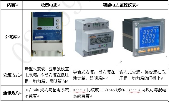 大型公共建筑電能計量宜采用電力儀表作為內(nèi)部管理電表,不宜用收費電表。兩者主要特點歸納如下(見表1)。