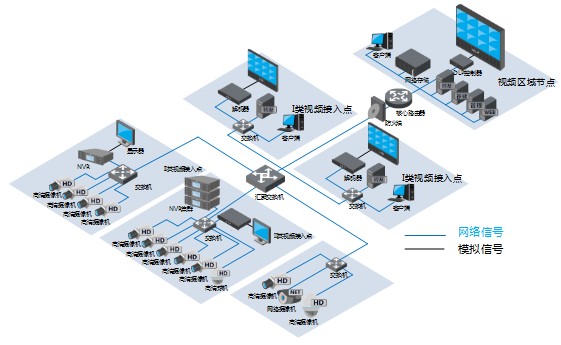 大華股份綜合視頻監(jiān)控系統(tǒng)由視頻采集點、視頻接入節(jié)點(I類和II類)、客運專線視頻區(qū)域節(jié)點和視頻傳輸網(wǎng)絡(luò)構(gòu)成,其中視頻接入節(jié)點、客運專線視頻節(jié)點和視頻傳輸網(wǎng)絡(luò)各系統(tǒng)共用,視頻采集點和監(jiān)視終端可根據(jù)各系統(tǒng)的需要進行設(shè)置,在很多場合也能實現(xiàn)各系統(tǒng)共用。