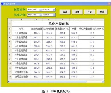 g. 單位能耗,自動計算單位產(chǎn)量能耗,并可打印及導(dǎo)出。單位產(chǎn)量能耗計算界面如圖3所示。