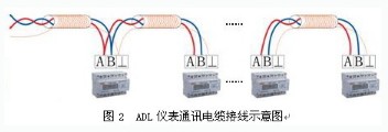 儀表之間采用屏蔽雙絞線進行總線型連接,通過通訊擴展卡進入監(jiān)控主機。圖2所示為ADL儀表通訊電纜接線示意圖。通過對配電系統(tǒng)的二次設(shè)備進行組網(wǎng),經(jīng)由通訊網(wǎng)絡(luò)到達監(jiān)控主機,將分散的配電所的現(xiàn)場設(shè)備連接為一個整體。