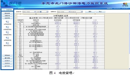 圖4所示為電能匯總報(bào)表,列出各回路電能數(shù)據(jù),方便客戶查詢和打印。根據(jù)業(yè)主需求可以查看日報(bào)表,月報(bào)表,年報(bào)表。清晰了解各用電單位在某一時(shí)間段內(nèi)的用電狀況,為決策層節(jié)能減排提供數(shù)據(jù)依據(jù)。