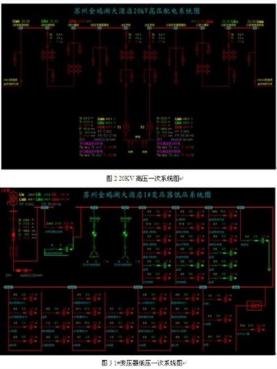 系統(tǒng)具有友好的人機(jī)界面,便于普通的現(xiàn)場(chǎng)值班人員查看并記錄相關(guān)信息,系統(tǒng)一次圖(如圖2、圖3)不僅顯示了線路的開關(guān)狀態(tài),還實(shí)時(shí)顯示電壓、電力、有功電度等重要的電力參數(shù)。所有數(shù)據(jù)信息都定期的保存到數(shù)據(jù)庫中。