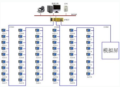 本電力監(jiān)控系統(tǒng)主要實現(xiàn)北京電氣工程學(xué)校變電所的0.4kV配電系統(tǒng)的用電監(jiān)測與模擬屏的實時監(jiān)控;監(jiān)測范圍為變電所的T1、T2變壓器的低壓進(jìn)線柜、聯(lián)絡(luò)柜、饋線柜中的智能電力儀表和模擬屏,從而實現(xiàn)遠(yuǎn)程實時監(jiān)測和模擬屏的實時監(jiān)控。該系統(tǒng)總計有61只儀表(其中全部為PZ系列智能儀表)和一個模擬屏,分4條總線,由于變電所與值班室距離較近,采用變電所內(nèi)自行組網(wǎng),然后通過擴(kuò)展卡直接接至電腦,實現(xiàn)該現(xiàn)場總線上儀表、模擬屏與監(jiān)控主機(jī)的數(shù)據(jù)連通。