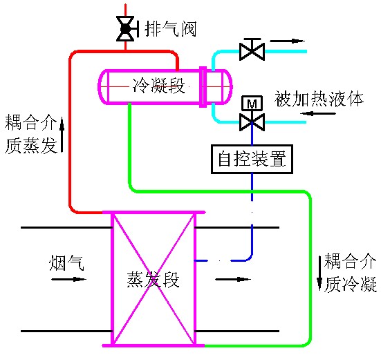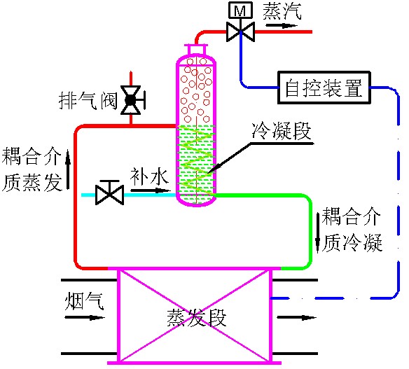 如耦合介質在工作過程中發(fā)生相變,則稱之為復合相變介質耦合換熱。從本質上講,此類換熱還是利用"超導熱元件"熱管的工作原理,繼承了其傳熱 特性和恒溫特性,摒棄了碳鋼水熱管的化學不相容性,不能整體熱管束控溫,成本高等缺點。復合 相變介質耦合換熱系統(tǒng)可在線再生真空度,可實現(xiàn)全管束壁面溫度相同,且可控可調。復合相變介質耦合換熱技術源于熱管技術,并且進一步發(fā)展和超越了熱管技 術。