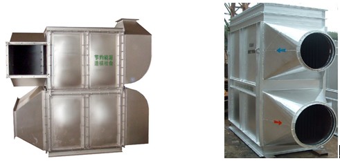 該換熱器為冷凝水專用余熱回收設備,安裝在疏水閥后面,回收冷凝水中的熱量,使冷空氣瞬間升溫,通過風機連續(xù)輸送穩(wěn)定熱風,起到烘干、加熱等作用。工作時,冷凝水溫度由100℃降到60℃,吹出50℃-60℃的熱風,極大地提高了經濟效益。