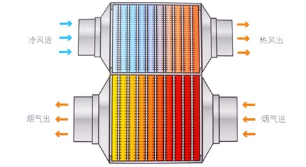 安裝于鍋爐煙口或煙道中,將煙氣余熱回收后加熱空氣、熱風可用作鍋爐助燃或干 燥物料。其構造如果所示:四周管箱,中間隔板將上下兩側通道隔開,單根熱管可更換。工作時,高溫煙氣流經熱管換熱器下部沖刷熱管,熱管吸熱,煙氣放熱溫度 下降。熱管將吸收的熱量傳至上部將流經熱管換熱器上部的冷空氣迅速加熱,此時熱管放熱,空氣吸熱溫度升高。