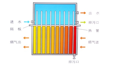 安裝于鍋爐煙口,將煙氣余熱回收后加熱生活用水或鍋爐補水。其構造如果所示:下部是煙道,上部為水箱,中間有隔 板,水箱有進出水接口和排污口。工作時,煙氣流經熱管余熱回收器煙道沖刷熱管下端,熱管吸熱后將熱量導至上端,熱管上端放熱將水加熱。為防止堵灰和腐蝕, 余熱回收器出煙氣溫度一般控制在露臺以上,及燃油,燃煤鍋爐排煙<130℃,燃氣鍋爐排煙溫度<100℃,節(jié)約燃料10-30%。