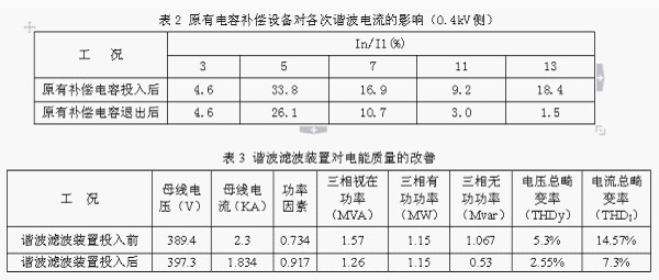 同一般低壓電容補(bǔ)償設(shè)備相比,ANAPF有源諧波濾波裝置除具有無功補(bǔ)償作用外,還具有濾波能力,使用戶注入系統(tǒng)的諧波電流大大降低,表2~3是某化工廠在兩組不同用電條件下的實(shí)測數(shù)據(jù)分析。