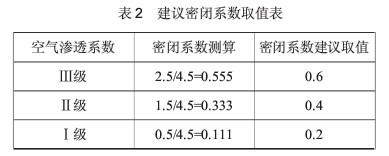 (2)密閉系數(shù)的確定和應(yīng)用:建筑物由門(mén)窗縫隙滲入的冷空氣量是由門(mén)窗兩側(cè)所存在的風(fēng)壓差和熱壓差所決定的,一般來(lái)說(shuō),風(fēng)壓差和熱壓差與建筑物的型 式、門(mén)窗所處的高度、朝向及室內(nèi)外溫差等因素有關(guān)。密閉系數(shù)(采取密閉的各種窗型測(cè)出的氣密性數(shù)據(jù)與未加密閉處理的窗型氣密性數(shù)據(jù)相比)見(jiàn)表1、表2。