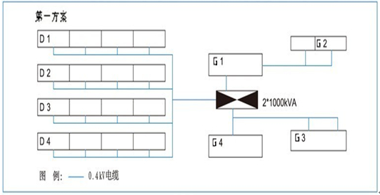 圖1和圖2所示是一個(gè)住宅小區(qū)的供配電方案比較。第一方案是采用兩臺1 000kVA的 變壓器集中設(shè)置變電所,變電所距用電負(fù)荷較遠(yuǎn),外部低壓電纜出線回路多,線路長,投資高,運(yùn)行費(fèi)用大,高低壓設(shè)備一次投資較??;第二方案是將兩臺大容量的 變壓器分解為若干容量較小的變壓器,以箱式變電站的型式供電,使變配電設(shè)施盡可能地接近負(fù)荷中心。該方案高低壓設(shè)備一次投資大,供電可靠性高,且運(yùn)行費(fèi)用 低。其運(yùn)行時(shí)間越長,節(jié)能效果就越明顯,但該方案由于箱變接近用電負(fù)荷中心,布置分散,管理起來不太方便,且占地多。綜合比較以上兩方案,建議在條件允許 時(shí)優(yōu)先選用第二方案。
