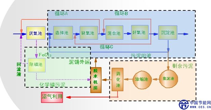 傳統(tǒng)污水處理工藝以能消能,消耗大量有機(jī)碳源,剩余污泥產(chǎn)量大,同時(shí)釋放較多CO2(因耗能)到大氣之中。當(dāng)今,全球普遍強(qiáng)調(diào)的可持續(xù)發(fā)展經(jīng)濟(jì)模式在 污水處理領(lǐng)域也得到體現(xiàn)。因此,研發(fā)以節(jié)省能(資)源消耗、并最大程度回收(用)有用能(資)源的可持續(xù)污水處理工藝已勢(shì)在必行,在詳細(xì)介紹兩種新近在歐 洲出現(xiàn)的可持續(xù)處理工藝--反硝化除磷、厭氧氨(氮)氧化的基礎(chǔ)上,提出一個(gè)以轉(zhuǎn)換有機(jī)能源(甲烷)、回收磷酸鹽(鳥(niǎo)糞石)、回用處理水(非飲用目的)為 目標(biāo)的可持續(xù)城市污水生物除磷脫氮推薦工藝。