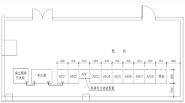 3)電氣設(shè)計(jì)人員在考慮系統(tǒng)接線及平面布置時(shí)應(yīng)注意將ANAPF的補(bǔ)償接入點(diǎn)盡量靠近補(bǔ)償對象,并處于采樣CT的上游,或在末端預(yù)留空間供設(shè)計(jì)安裝,CT采樣處下游不能包含容性負(fù)荷。平面布置示意如下圖: