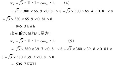 改造前后運(yùn)行狀況基本一樣,分別取兩天24 小時的數(shù)據(jù)進(jìn)行比較。改造前得到水泵電流分別為:66.9A,65. 4A,65.9A,改造后取水泵電流分別為:39.7A,39.8A,39.3A。輸入電壓取380V,功率因素取0.81。