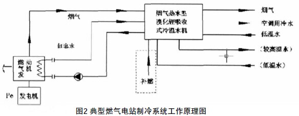 將可燃廢氣通入燃?xì)獍l(fā)動(dòng)機(jī),燃燒做功帶動(dòng)發(fā)電機(jī)發(fā)電,產(chǎn)生的煙氣(約600℃)進(jìn)入余熱鍋爐。水通過發(fā)動(dòng)機(jī)本體換熱器再進(jìn)入余熱溴化鋰制冷機(jī)組,產(chǎn)生 低溫水和較高溫水。低溫水可用作空調(diào)制冷,較高溫水可用作生活用熱水。這種技術(shù)實(shí)現(xiàn)了熱電冷聯(lián)產(chǎn),既可以發(fā)電,又可以供熱和供冷。(見圖2)