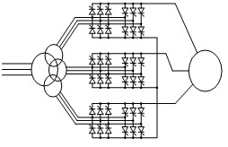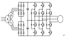 交-交結構沒有直流回路,每相都由兩個相互反并聯(lián)的整流電路組成,正橋提供正向相電流,反橋提供負向相電流。裝置元件數(shù)量比較多、元件利用率比較低、調頻范圍窄,為電網(wǎng)頻率的1/3~1/2、電網(wǎng)功率因素利用率低。