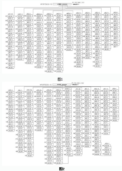 地下二層配電間采用ACR網(wǎng)絡電力儀表和PZ三相電能表共182臺,地上八樓層配電箱采用ADL100和ADL300共321塊儀表,共采用32根屏蔽雙絞線連接至2臺16口串口服務器,串口服務器經(jīng)交換機進行數(shù)據(jù)的集中采集,現(xiàn)場儀表至串口服務器的組網(wǎng)如圖1、圖2: