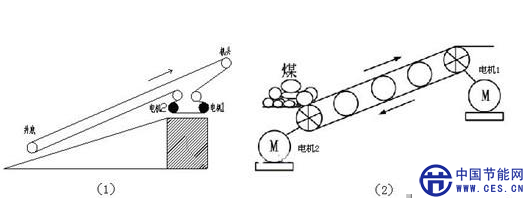 皮帶機(jī)廣泛應(yīng)用于礦山、冶金、煤炭等部門(mén),是煤礦的關(guān)鍵設(shè)備,它肩負(fù)著礦井上下輸送松散物料或成件物品的重任。根據(jù)輸送工藝要求,可以單臺(tái)輸送,也可多臺(tái)組成或與其他輸送設(shè)備組成水平或傾斜的輸送系統(tǒng),以滿(mǎn)足不同布置型式的作業(yè)線需要。以?xún)膳_(tái)電機(jī)的皮帶系統(tǒng)為例,如圖1:其中(1)為兩臺(tái)電機(jī)在井上位置,(2)一臺(tái)電機(jī)在井上,一臺(tái)電機(jī)在井下。
