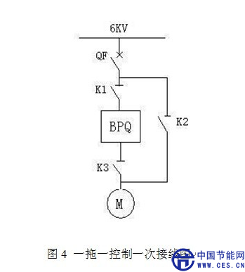 現(xiàn)場(chǎng)采用兩套山東新風(fēng)光電子科技發(fā)展有限公司生產(chǎn)的JD-BP37-450P高壓變頻調(diào)速系統(tǒng),額定電壓6kV,額定電流54A,額定功率450kW,采用“一拖一”主從控制方案,主回路控制接線如圖4所示。