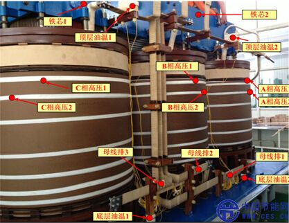 經(jīng)與變壓器廠商議,在A,B,C三相高壓繞組上,每相安裝2個(gè)傳感器,位置分別在第二和第三個(gè)線餅之間、第四和第五個(gè)線餅之間;頂層和底層油溫部分,各安裝兩個(gè)傳感器;鐵芯上安裝2個(gè)傳感器;母線排上安裝3個(gè)傳感器。如圖6所示: