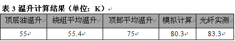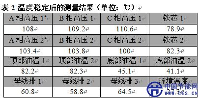 表2是溫升試驗(yàn)中,繞組、鐵芯、母線與油溫度穩(wěn)定后的測(cè)量結(jié)果。