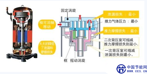 眾所周知,制冷劑的壓縮過程中,渦旋腔體軸向和橫向的微小泄露都會增加壓縮阻力,并降低壓縮效率。“框架結(jié)構(gòu)”的意義在于,無需要任何附加的機(jī)械裝置,利用制冷劑氣體的壓力和框架的可移動特性能實(shí)現(xiàn)了壓縮腔體的自我調(diào)節(jié),將泄漏降至最低,維持壓縮機(jī)能力輸出。