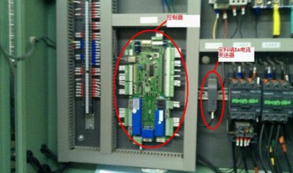 其產(chǎn)品內(nèi)部的電器控制部分,機(jī)組啟動(dòng)與控制的所有元件均安裝在電控箱(圖2)內(nèi),由工廠接線并完成功能測試,電器控制部分包括:文本控制器、主接觸器、塑殼斷路器等。