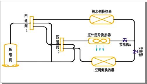 (3)與太陽能供熱系統(tǒng)的結合。目前太陽能越來越多的應用到建筑熱水供應和空調采暖系統(tǒng)之中,但是因為太陽能資源的不穩(wěn)定性,基本上需要常規(guī)能源作為輔助,如采用電鍋爐、染油(氣)鍋爐輔助加熱。將高溫空氣源熱泵與太陽能結合用于建筑熱水供應和采暖系統(tǒng),一方面可以節(jié)省大量的能源費用,減少對環(huán)境的污染,另一方面,對太陽能熱水的溫度要求降低,在滿足供熱溫度的同時極大的提高了太陽能集熱器的吸熱效率,減少集熱器的投資。