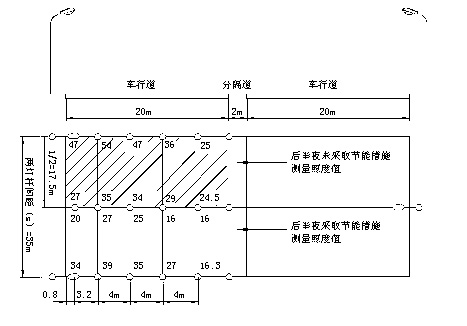 后半夜未采用節(jié)能時(shí)電壓為242V時(shí)現(xiàn)場測量路面平均照明Eav=35lx,后半夜采用節(jié)能措施后電壓為192V時(shí),現(xiàn)場測量路面平均照度Eav=25lx。