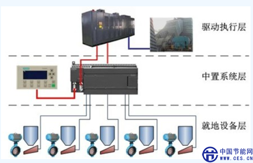 該系統(tǒng)采用分散控制、集中管理的控制方式,分三級結(jié)構(gòu)實現(xiàn)工藝需求與系統(tǒng)節(jié)能的雙向協(xié)調(diào),系統(tǒng)結(jié)構(gòu)示意圖如下所示。分散揚塵點就地實現(xiàn)振動篩、下料斗等工位的支路吸附點自動開閉,有效降低系統(tǒng)非除塵通風(fēng)量的需求;中置控制器實現(xiàn)對揚塵點工況的集中監(jiān)測,根據(jù)各工位運行情況計算礦槽除塵系統(tǒng)的實時風(fēng)量需求。從而,給定變頻運行頻率控制值,遠(yuǎn)傳4~20mA頻率調(diào)節(jié)指令至除塵風(fēng)機變頻器實現(xiàn)除塵風(fēng)量的連續(xù)變工況調(diào)節(jié)。除塵系統(tǒng)隨礦焦配料系統(tǒng)的運行工況結(jié)合各配料點除塵需求,實時改變風(fēng)量和除塵點負(fù)壓,確保每個除塵點既達(dá)到理想除塵效果,又能有效降低除塵風(fēng)機功耗,達(dá)到環(huán)保、節(jié)能、高效的目的。