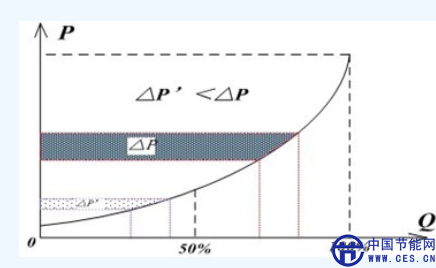 4. 根據(jù)流體力學(xué)風(fēng)機功率與風(fēng)量之間的相似定理P∝Q3立方成正比的關(guān)系,如下圖所示:風(fēng)量低于50%水平后,風(fēng)量下降所帶來的功率下降將越來越小。在50%以上區(qū)間調(diào)節(jié)20%風(fēng)量帶來的功率下降收益△P=0.296Pu,50%以下區(qū)間調(diào)節(jié)20%風(fēng)量所帶的節(jié)能收益△P’ =0.056Pu。顯然,在低風(fēng)量條件進行開閉控制時,其設(shè)備投入與節(jié)電收益的投入產(chǎn)出的經(jīng)濟性指標(biāo)下降,不適宜50%以下的更低風(fēng)量的控制調(diào)節(jié)。