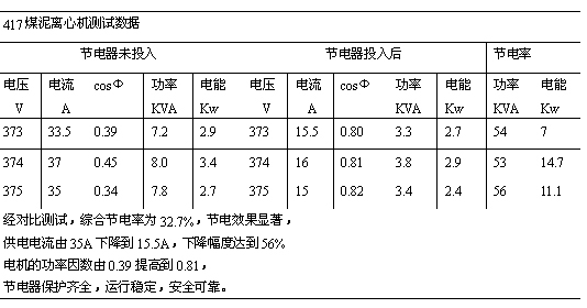 陽煤集團(tuán)二礦選煤廠有兩臺煤泥離心機(jī)(設(shè)備編號:417,418),設(shè)備功率相同,負(fù)載相同,同時開停,在其中一臺安裝電機(jī)節(jié)電器,另一臺不用電機(jī)節(jié)電器,這樣就可以作出科學(xué)的對比結(jié)果,選擇在417上安裝了電機(jī)節(jié)電器,418按原來控制方法運(yùn)行,兩臺設(shè)備同時都加裝了電度表進(jìn)行測試。同時在電機(jī)節(jié)電器投入運(yùn)行前后,對417煤泥離心機(jī)的運(yùn)行數(shù)據(jù)進(jìn)行測量對比,了解節(jié)電器的運(yùn)行效果。