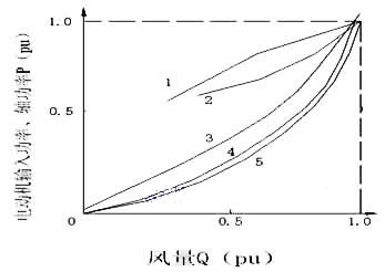 1—輸出端風(fēng)門控制時(shí)的電動機(jī)輸入功率2—輸入端風(fēng)門控制的電動機(jī)輸入功率3—轉(zhuǎn)差功率調(diào)速(滑差電動機(jī)、液力耦合器)時(shí)電動機(jī)的輸入功率4—變頻器調(diào)速控制時(shí)的電動機(jī)輸入功率5—理想輸入功率